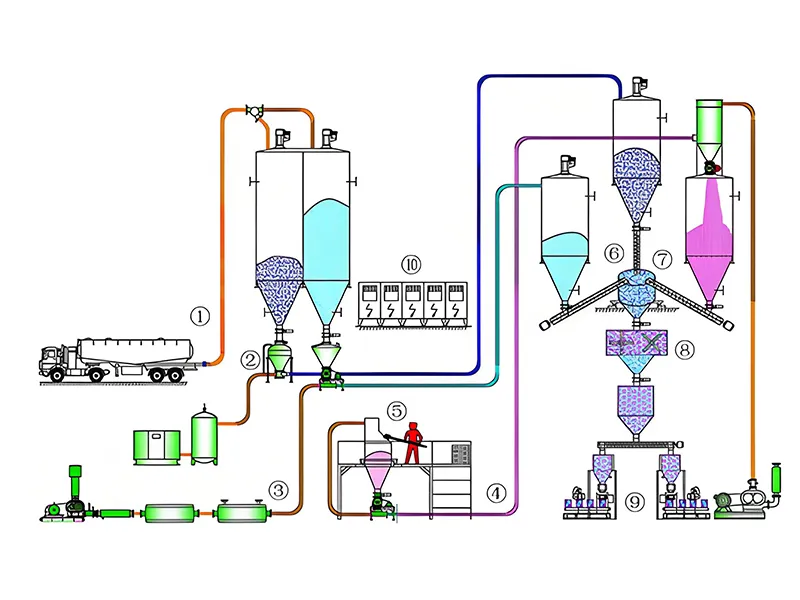 النقل الهوائي للمواد الصلبة – القوة والدقة تكمن في تقنيتنا المتقدمة والتي تسمح بنقل المساحيق والحبيبات من نقاط التغذية إلى وجهاتها المحددة عبر أنابيب مغلقة باستخدام تدفق هواء مضغوط أو طاقة ميكانيكية، مع ضمان أعلى مستويات الكفاءة والسيطرة. ولأننا نفهم أن كل عملية تحتاج إلى دقة مطلقة، يمكن دمج وظائف إضافية بسلاسة، تشمل الوزن والجرعات (تحديد الكميات)، المزج أو الفصل، فتح الأكياس، تحميل وتفريغ المواد، وجمع الغبار، لتقديم تجربة مناولة مواد آلية بالكامل، نظيفة، وآمنة، تضع الجودة والإنتاجية في صدارة أولوياتك.
