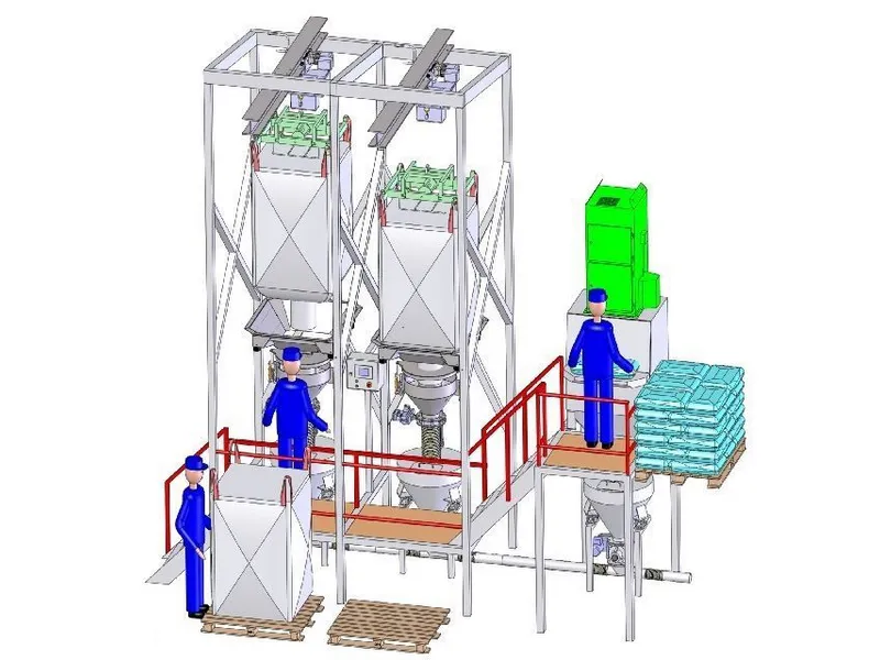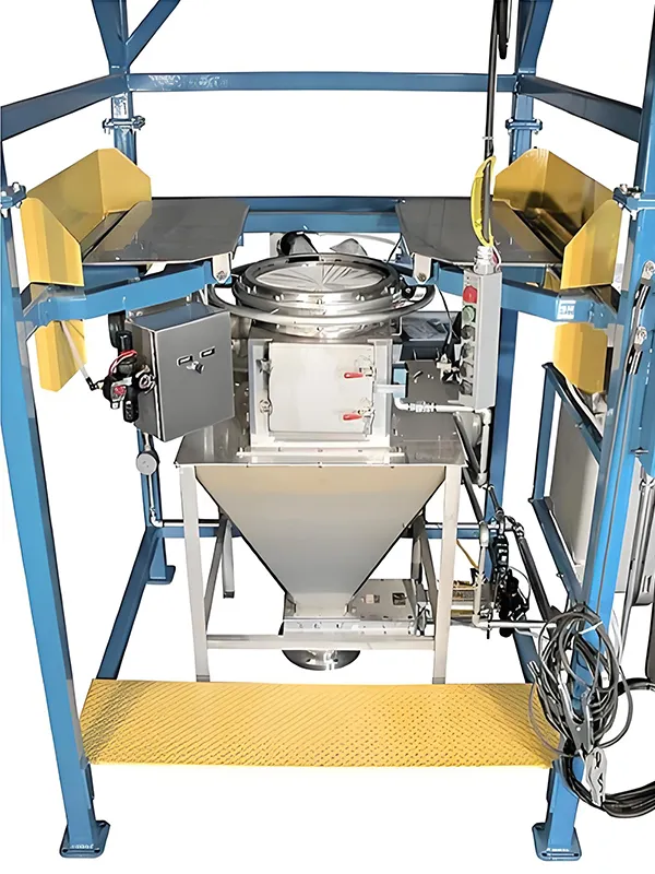 محطة تفريغ الأكياس، والمعروفة أيضاً بمحطة تفريغ الأكياس الخالية من الغبار، مصممة للتفريغ اليدوي لكل من الأكياس الصغيرة والأكياس الكبيرة (أكياس الطن/ أو وزن 1000 كغ)، حيث يقوم المشغلون بفتح الأكياس يدوياً وتفريغ محتوياتها في القادوس، وتساعد الجاذبية في نقل المواد إلى صومعة التخزين. كما تجدر الإشارة إلى أن العملية بالكامل تتم ضمن حاوية مغلقة، مدعومة بنظام إزالة الغبار المدمج الذي يشمل جسم المحطة، الفلتر (المرشح)، ومروحة استخلاص (شفط) الغبار لمنع انبعاث الغبار والحفاظ على بيئة عمل نظيفة.